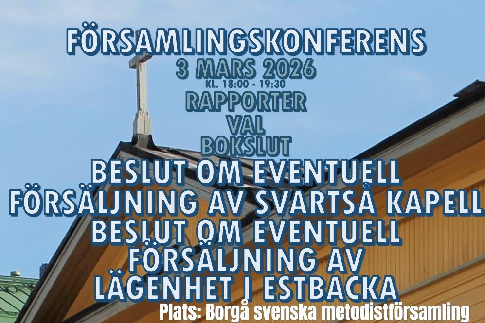 På församlingskonferensen görs val till förtroendeuppdrag, avges rapporter och besluts om försäljning av fastigheter. Alla som är medlemmar i metodistförsamlingarna i Lovisa, Borgå eller på Svartså krets är varmt välkomna att delta.
